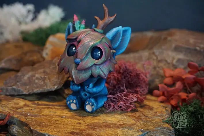 Brûn es el espíritu contemplativo del bosque Grimmiz. Sentado y mirando al cielo, este pequeño habitante del bosque transmite sabiduría y un aire mágico. Diseñado en 3D, impreso en resina y pintado a mano, cada detalle de Brûn está trabajado para reflejar su naturaleza serena y mística.